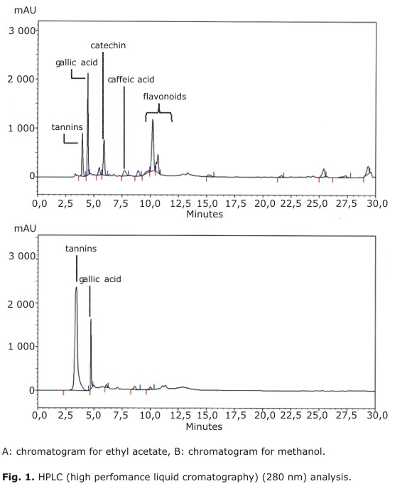 (catechin) and gallic acid, flavonoids and caffeic acid derivates as main constituents.