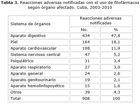 Se concluye que la caracterización realizada de las sospechas de reacciones adversas (RAM) asociadas al uso de fitofármacos comercializados en Cuba período 2003-2010, muestra similitud con la reportada a los medicamentos de síntesis química; son el ajo, la sábila y la caña santa los fitofármacos responsables de la mayoría de las RAM en los adultos, que provoca manifestaciones en aparato digestivo y piel de tipo leve.